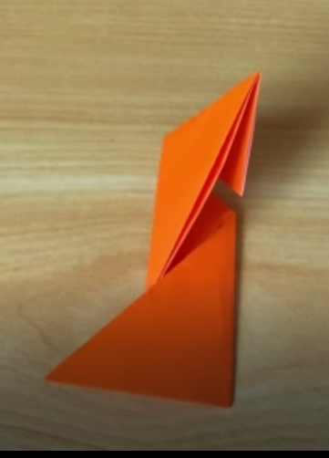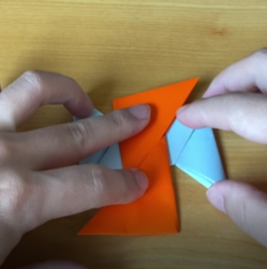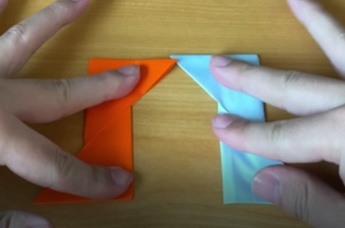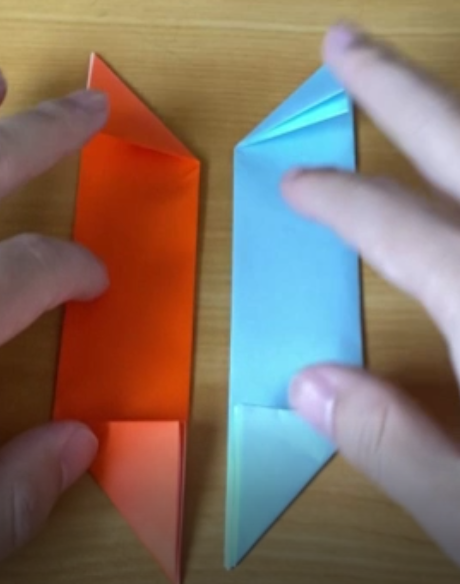斜めに折り目を入れてい二つとも折り終わると、こんな感じになります。